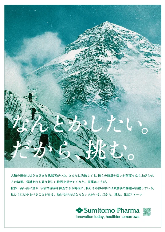人類の歴史にはさまざまな挑戦者がいた。どんなに失敗しても、彼らの熱意や想いが何度も立ち上がらせ、その結果、常識を打ち破り新しい世界を見せてくれた。 医薬はどうだ。 空を自由に飛び、宇宙にまで届く時代に、私たちの体の中には未解決の課題が山積している。私たちにはやるべきことがある。助けなければならない人がいる。だから、挑む。 住友ファーマは、革新的な医薬品の研究開発をより加速させ、人々の健康で豊かな生活のために、挑み続けます。
