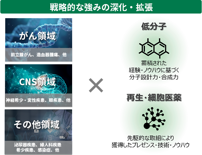 基幹3製品を中心とした既存製品の価値最大化と徹底したコスト管理により損益基盤を確立するとともに、開発パイプラインの選択と集中によりフリーキャッシュフローの維持と次なる収益基盤の獲得を両立します。また、研究開発型製薬企業としての再起に向け、当社はがんおよび再生・細胞領域における自社イノベーションの結実を必達目標として取り組んでいきます。また、継続的なイノベーションの創出・社会実装に向けて、研究開発の成功確度向上を図ります。
