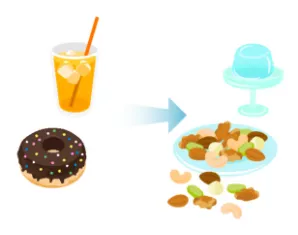(菓子類やソフトドリンク、フルーツ⇒ 豆類、ナッツ類、乾燥昆布や寒天製品など糖質が少なく食物繊維を多く含むもの)