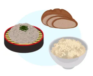 表は主食1食分当たりのエネルギー量と食物繊維量を示したものです。最低1日に1食は日本そば、ライ麦パン、玄米、もち米玄米、麦ご飯などに変えてみてはいかがでしょうか。
