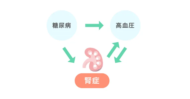 また、高血圧と腎臓は相互に密接に関係し、高血圧は腎症の原因となり、また腎症になると高血圧が重症化します。2型糖尿病による高血糖の状態が続くと、糖尿病腎症や糖尿病網膜症、糖尿病神経障害などの合併症を発症するリスクも高まります。