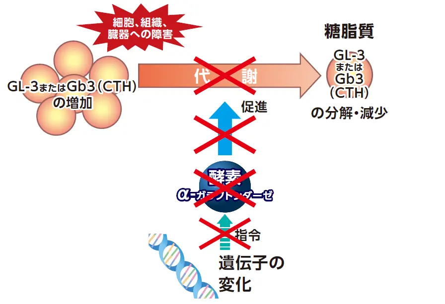 この酵素は、「GL-3またはGb3(グロボトリアオシルセラミド、別名セラミドトリヘキソシド:CTH)」という糖脂質を分解する働きを持ちますが、活性が不十分だと分解されなかったGL-3が徐々に全身の細胞や組織、臓器に蓄積していきます。蓄積したGL-3がある一定量を超えると、疼痛を含む神経症状、被角血管腫(ひかくけっかんしゅ)、角膜混濁(かくまくこんだく)の他、心機能障害、腎機能障害など、様々な症状が出現します。