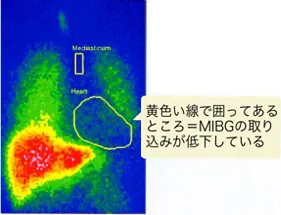 パーキンソン病の患者さんでは、MIBGの心筋への取り込みが低下している。