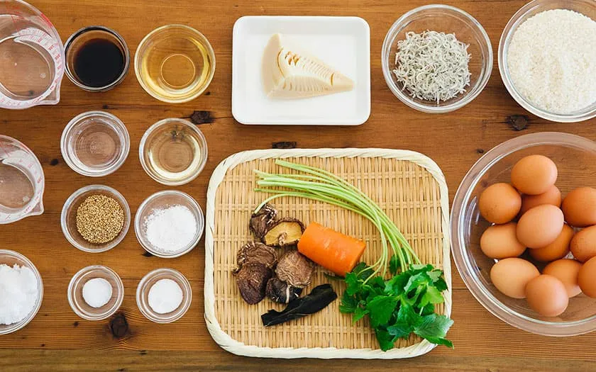 2.たけのこは食べやすい大きさの薄切りに、にんじんは長さ3cmの拍子木切りにします。水気を絞ったしいたけは軸を落とし、薄切りにします。