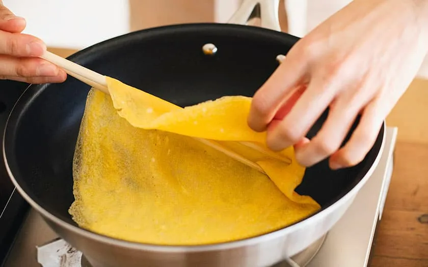 8.卵の表面が乾いてきたら菜箸を卵の真ん中にくぐらせ、卵を持ち上げて裏返し、さっと焼きます。伏せたボウルなどに広げて粗熱をとり、残りも同様にして計12枚焼きます。