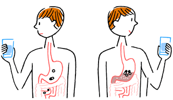 内用薬の多くは、胃で溶けて小腸で吸収されますが、空腹のときに薬をのむと、薬は胃から小腸へと速やかに移行します。一方、食後に薬をのむと、胃の中で薬と食べ物が一緒になるため、薬が小腸へ届くまでに時間がかかります。