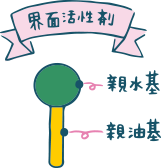 界面活性剤の分子の中には、油となじみやすい部分(親油基)と水になじみやすい部分(親水基)がある。