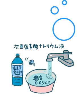 市販の塩素系漂白剤を、次亜塩素酸ナトリウムの濃度が0.05%になるように水で薄めて使います。商品ごとに濃度が異なりますので、厚生労働省のポスターの情報を参考にして薄めてください。