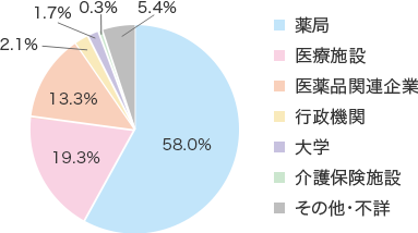 まずはみんなにとって一番身近な存在ではないかなと思われる、ドラッグストアにいる薬剤師の仕事を紹介するね。上の円グラフだと「医薬品関連企業」のところに入る人たちだよ。(注1)