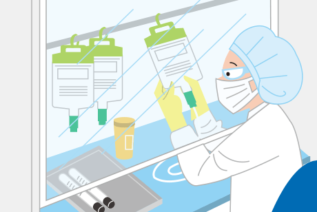 がんの治療に用いる抗がん薬の調製も行う。抗がん薬はとても強い作用があるので、体についたり吸い込んだりしないようにガウンや手袋、マスクなどを着けて、清潔に保たれた専用の部屋で行う。菌が入っては困る注射や点滴などの「無菌製剤」の調製も同様の設備を用いる。市販されている医薬品では治療ができない場合などに、院内製剤と呼ばれる薬剤を作ることもある。