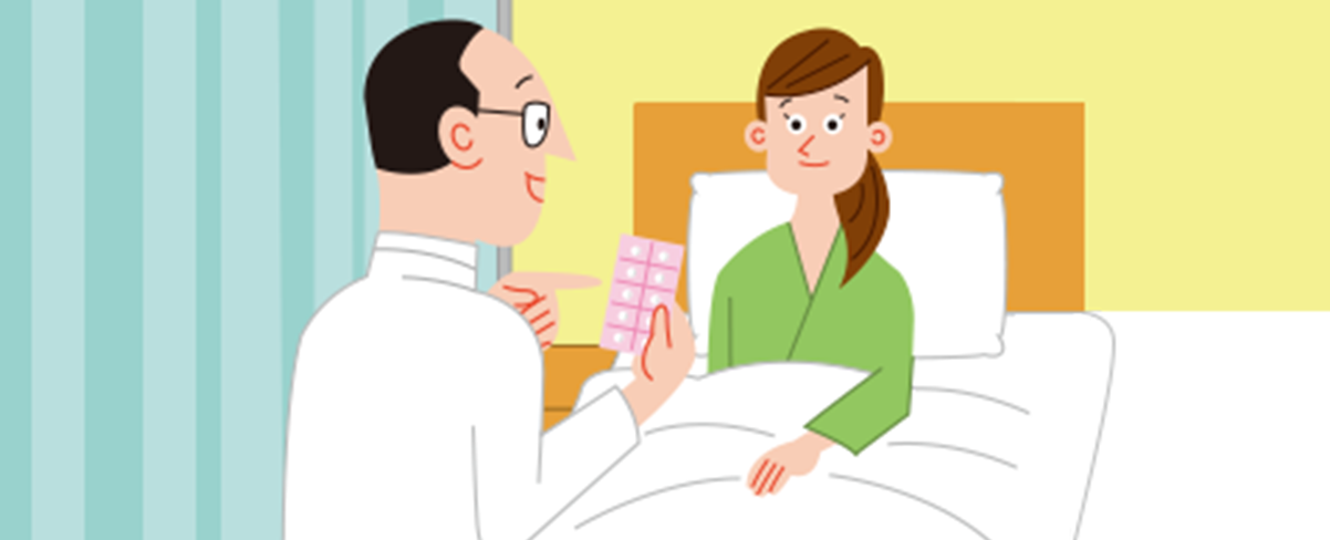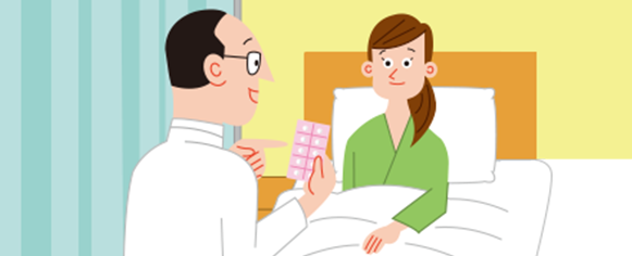 入院患者さんの病室で、治療に用いる薬の作用や副作用、使い方などを説明する。患者さんが入院前からのんでいる処方薬や市販薬、健康食品などを確認し、病院での治療のために減量または中止したほうがいいものがあれば医師に提案することもある。薬が効いているか、副作用が出ていないかなども確認する。