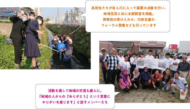 現在は徳島県内の高校生と、有志卒業生たちで活動中。毎年後輩たちが同様のプロジェクトを受け継ぎ、蘇らせる街河川を増やしています。市長や地元企業に協力を依頼し、活動の成果を国際学会などで発表しているほか、資材の調達に地元企業を利用するなど、地域の活性化も推進。自治体からの要請にも積極的に応じ、良質な水環境だけでなく、世代を超えたあたたかいコミュニティづくりにも貢献していきたいと意欲を示しています。