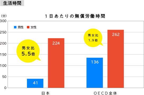 無償労働っていうのは、家事や子育てや介護のように賃金の発生しない労働のこと。日本では女性の方が男性の5.5 倍も無償労働に時間を割いているんだ。OECD 全体の平均と比べても、無償労働が女性に偏っていて、男性は無償労働にあまり時間を使っていないことがわかるね。