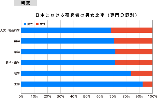 研究者も男性が多いんだね。理学や工学分野は特に女性の割合が低い。