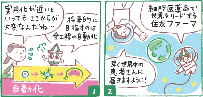 SMaRTには、同質の細胞を自動化して大量に育てる装置、目的の細胞だけを速く正確に選び分ける装置を導入しました。現状では手作業で行う工程も多いですが、将来的に目指すのは全工程の自動化です。細胞医薬品の製品化に向け「この分野で世界をリードする」という使命感のもと、住友ファーマは挑戦し続けます。