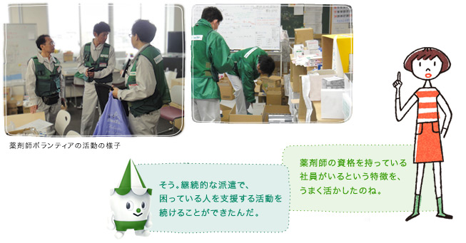 できることの一つとして「薬剤師資格を持つ社員を被災地へ派遣」することをまず決定したんだよ。