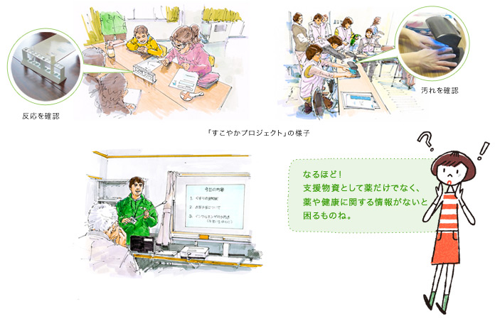 「からだ・くらし・すこやかに 隊」は岩手県陸前高田市において、清掃やドブの泥出し、がれきの撤去、草刈りなど、人手が必要とされる作業を、2011年6月から12月にかけて継続的に行いました。2012年からは、被災された方々の暮らしにすこやかさを取り戻してもらうことを目的とした「すこやかプロジェクト」を立ち上げ、宮城県・福島県において、被災地の子どもたちだけでなく、生活支援相談員の方々に対しても「薬の豆知識勉強会」や「手洗い勉強会」を行い、薬と健康に関する情報を伝えました。