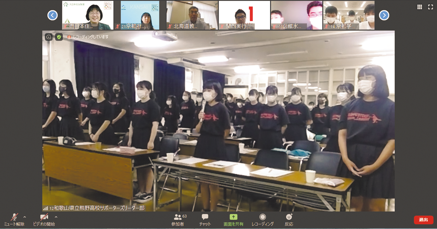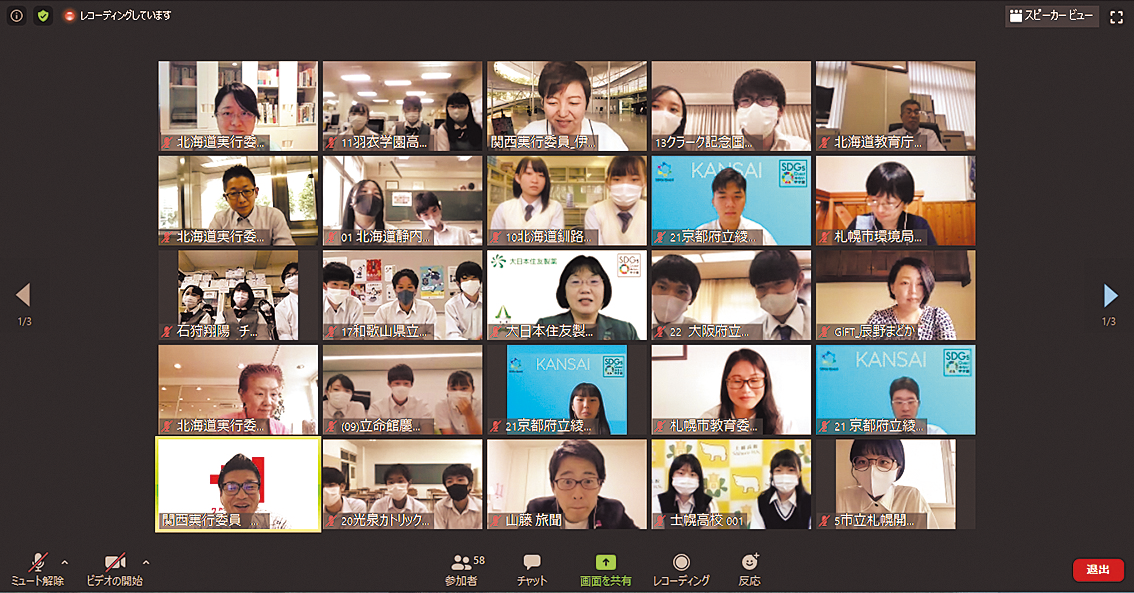 関西2府4県在住の高校1・2年生から計143件の「SDGsアクション」のアイデアが集まりました。当初は3月に表彰式が予定されていましたが、新型コロナウイルス感染症の影響から延期となり、8月にオンラインで開催されました。当日はZoomで各校をつなぎ、関西エリア大会と北海道エリア大会の合同表彰式を実施したため、同じ会場には集合することが難しい北海道の高校生ともオンラインでの交流が実現しました。