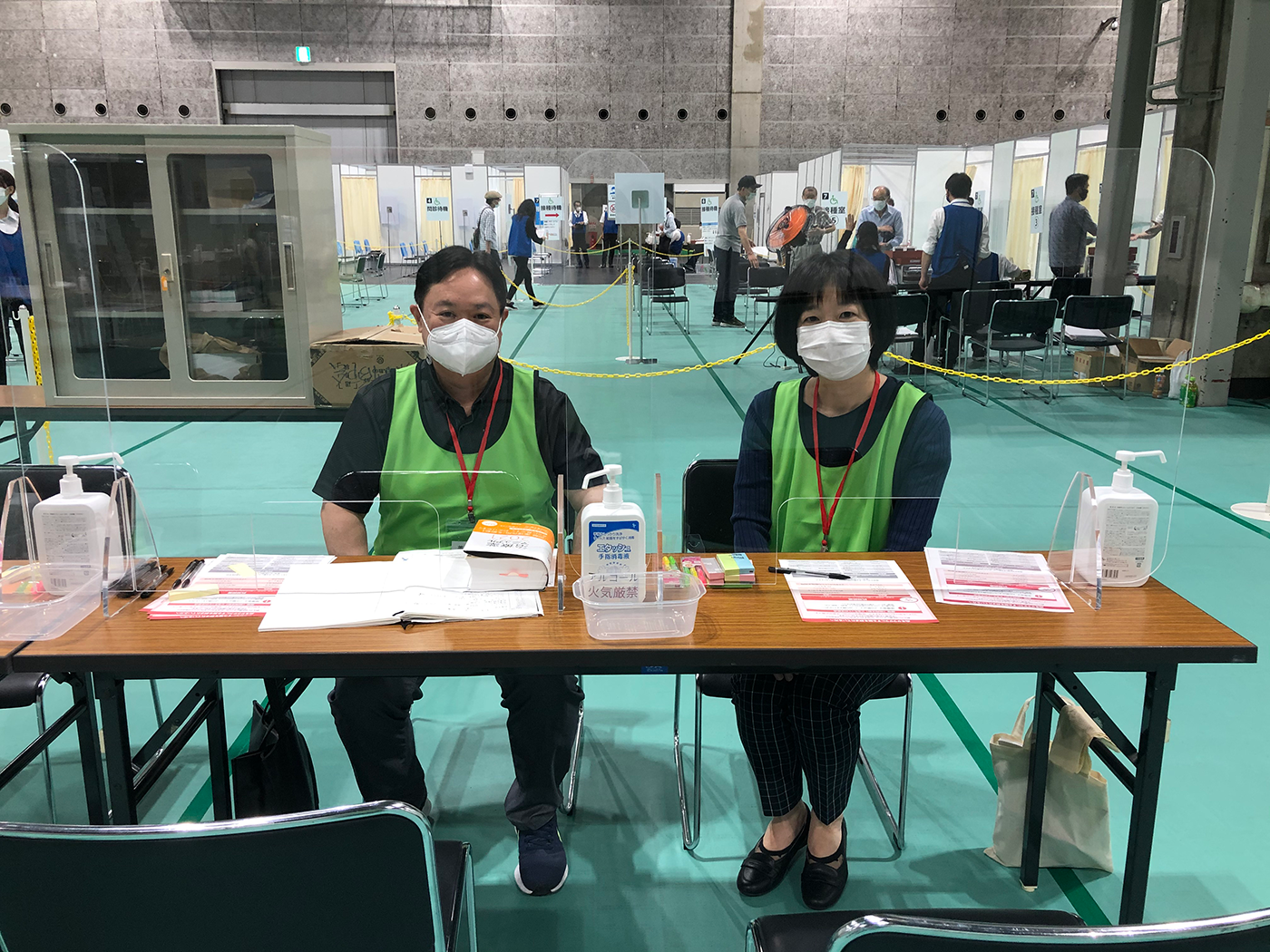 当社には薬剤師資格をもつ社員が多く働いており、新型コロナワクチンの大規模接種会場での薬剤師ボランティアを呼びかけたところ、84名の応募がありました。薬剤師ボランティアはボランティア休暇制度を利用して、大阪府薬剤師会に協力する形で、2021年6月に大阪市が開設した大規模接種会場(インテックス大阪)で補助業務を支援しました。