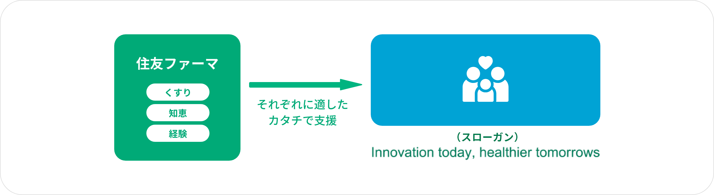 スローガン“Innovation today, healthier tommorrows” には、従業員一人ひとりが、つねに自らの変革(=Innovation) を追求しながら、新たな発想や高い研究開発力により革新的な新薬を社会に届けることで、患者さんとそのご家族が、より健やかに自分らしく(=healthier)過ごせる日々を実現したいという、私たちの強い意志が込められています。