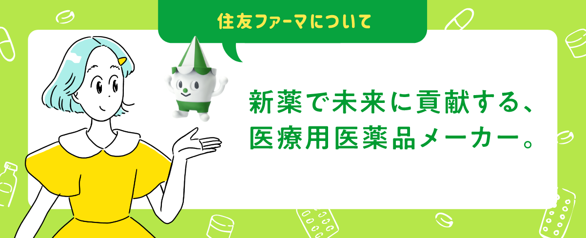 住友ファーマってどんな会社なのか、ここで少しだけ自己紹介をさせてね!
